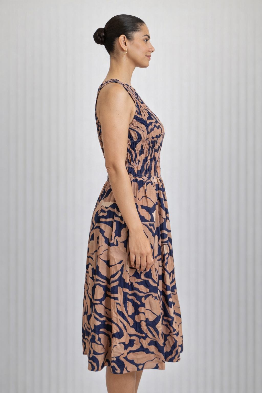 Embrace effortless elegance in this sleeveless midi dress, designed for movement and comfort. The elastic bodice creates a flattering gathered waist while the soft, flowing skirt drapes beautifully to midi length. An eye-catching abstract print in navy multi adds visual intrigue to your everyday wardrobe. Perfect for transitional seasons, this piece pairs seamlessly with sneakers for casual outings or sandals for weekend adventures.