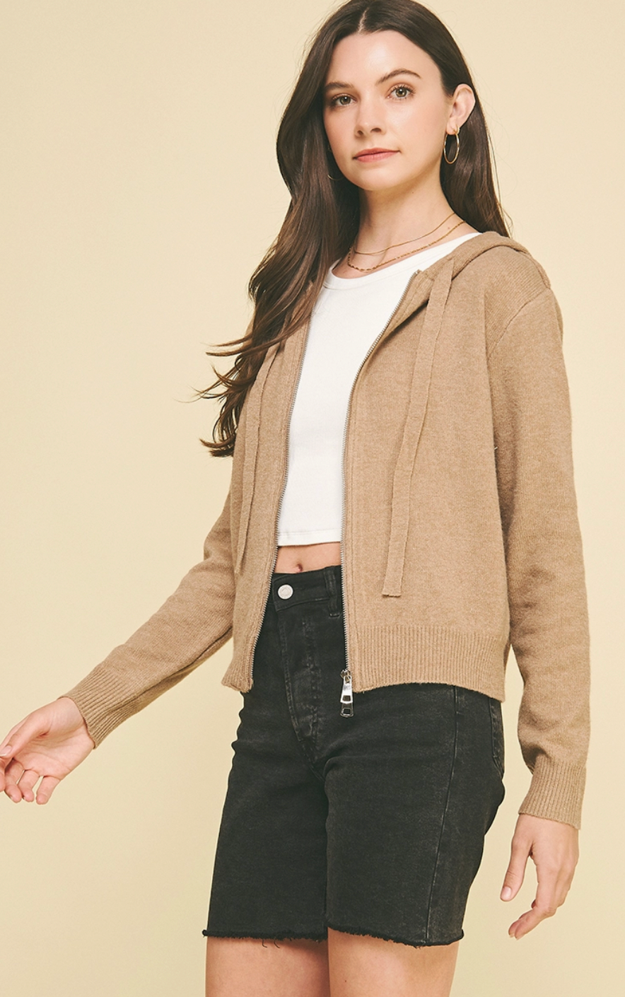 Elevate your fall wardrobe with the Aleena Zip Up Sweater by Pinch Brand. Crafted from cozy sweater material, this mocha-colored hoodie combines warmth and style effortlessly. Its zip-up design adds versatility, making it perfect for layering on crisp autumn days. Embrace comfort and chic fall fashion in one essential piece.