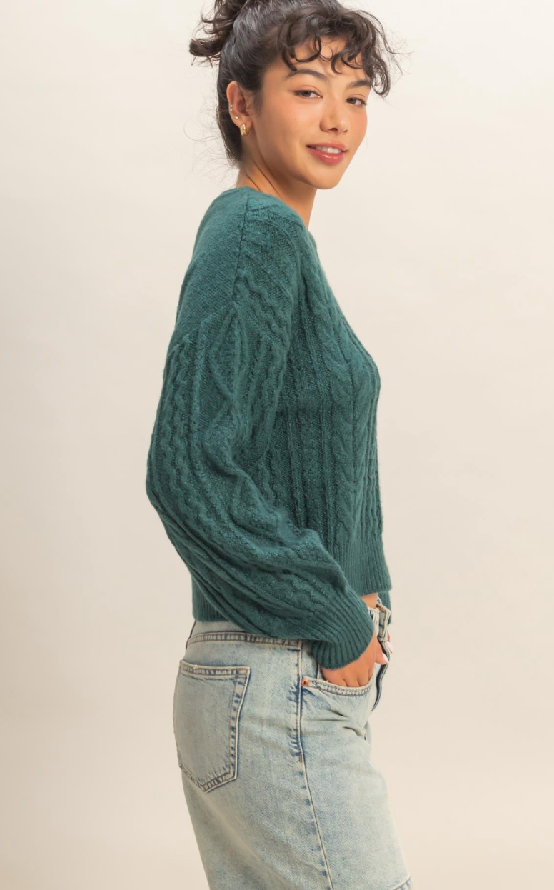 Effortlessly chic and undeniably cozy, the Sheri Cable Knit Sweater combines timeless style with everyday comfort. Crafted in a lightweight cable knit that feels ultra soft against the skin, this crew neck sweater hits right at the waist for a flattering, versatile silhouette. The rich dark green hue pairs seamlessly with your favorite denim or tailored trousers, making it a wardrobe essential for the seasons.