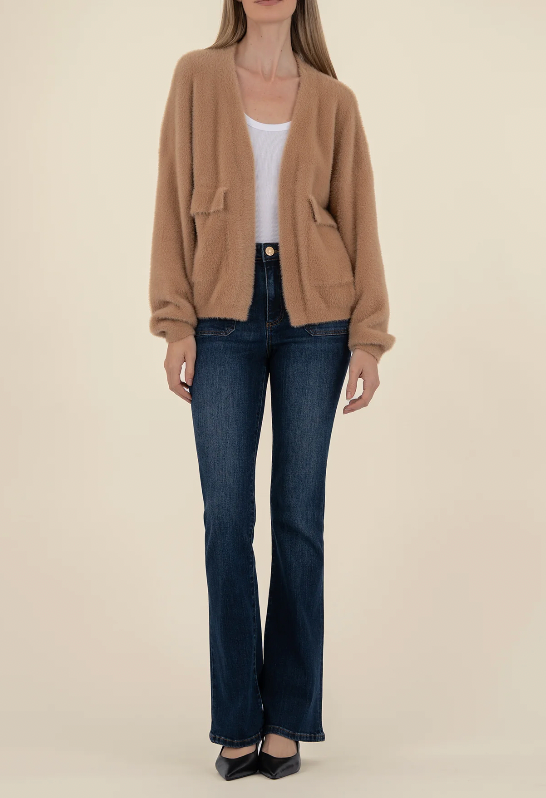 - Our favorite cozy cardigan! This ivory, faux-fur cardigan is perfect for those cooler months. The military style pockets and perfectly draped neckline, makes this a closet staple!